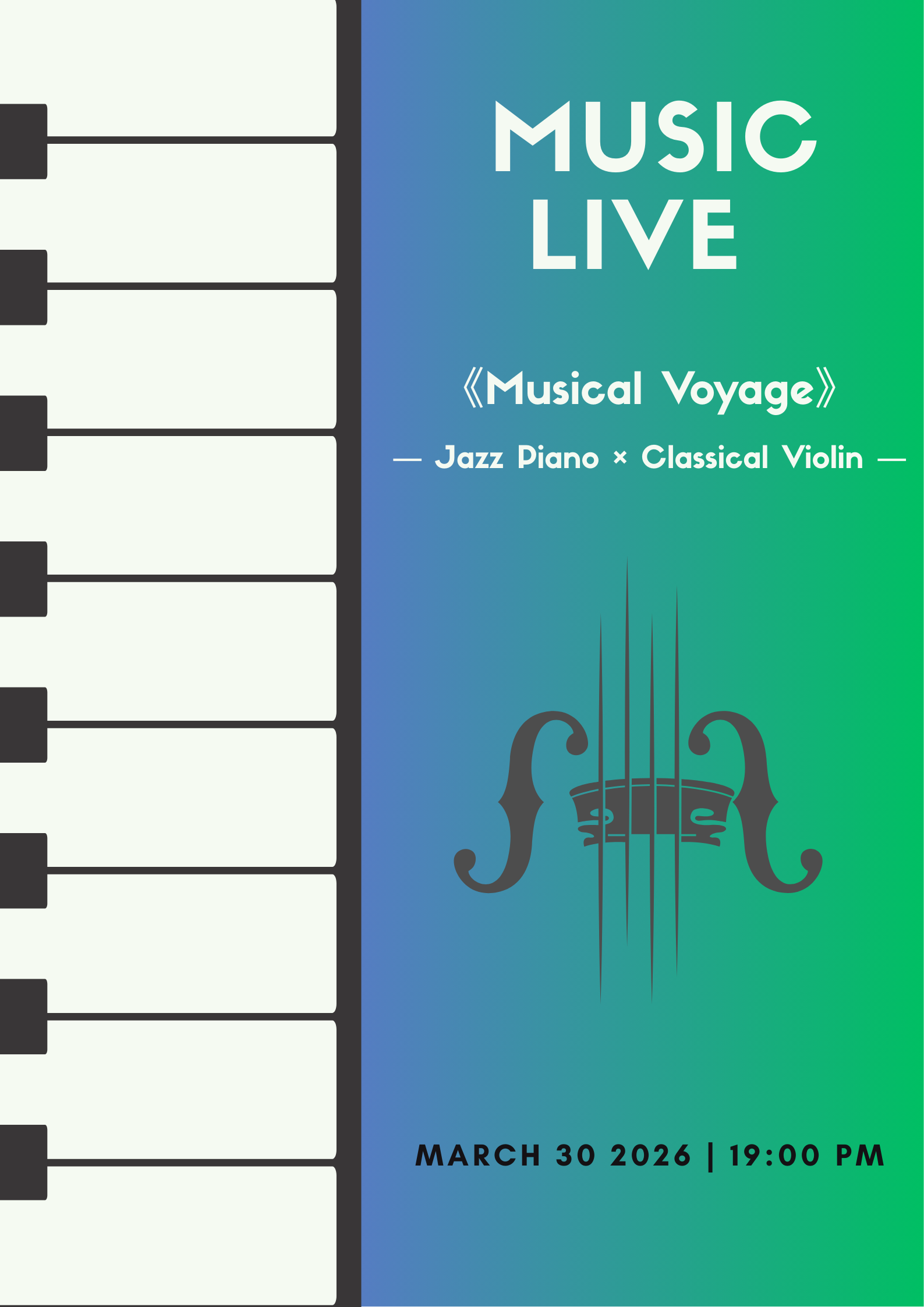 Through an exquisite collaboration of jazz piano and classical violin, we will deliver a diverse program that feels like a journey around the world.
